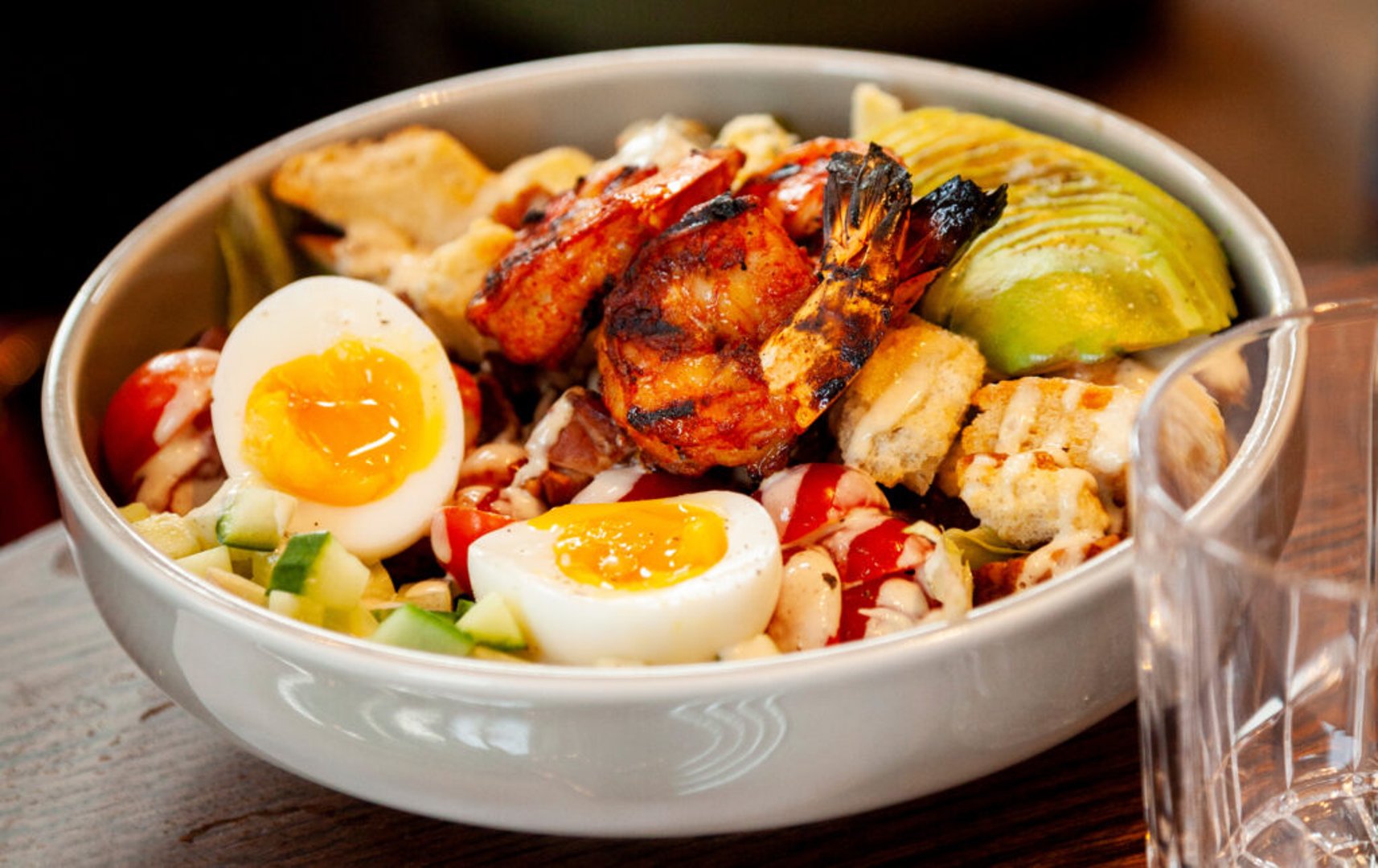 greens, avocado, soft-boiled egg, cucumber, tomato, lardons, cucumber, grana padano, caesar vinaigrette